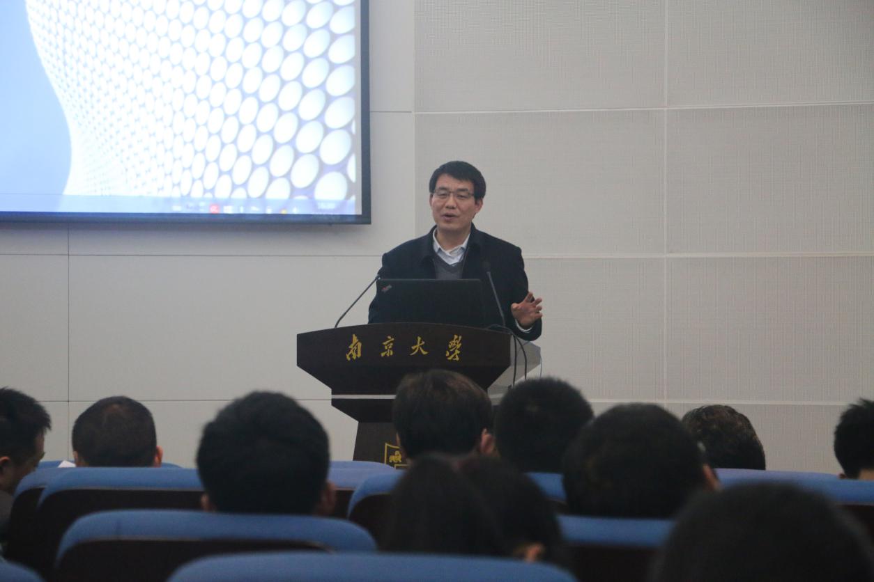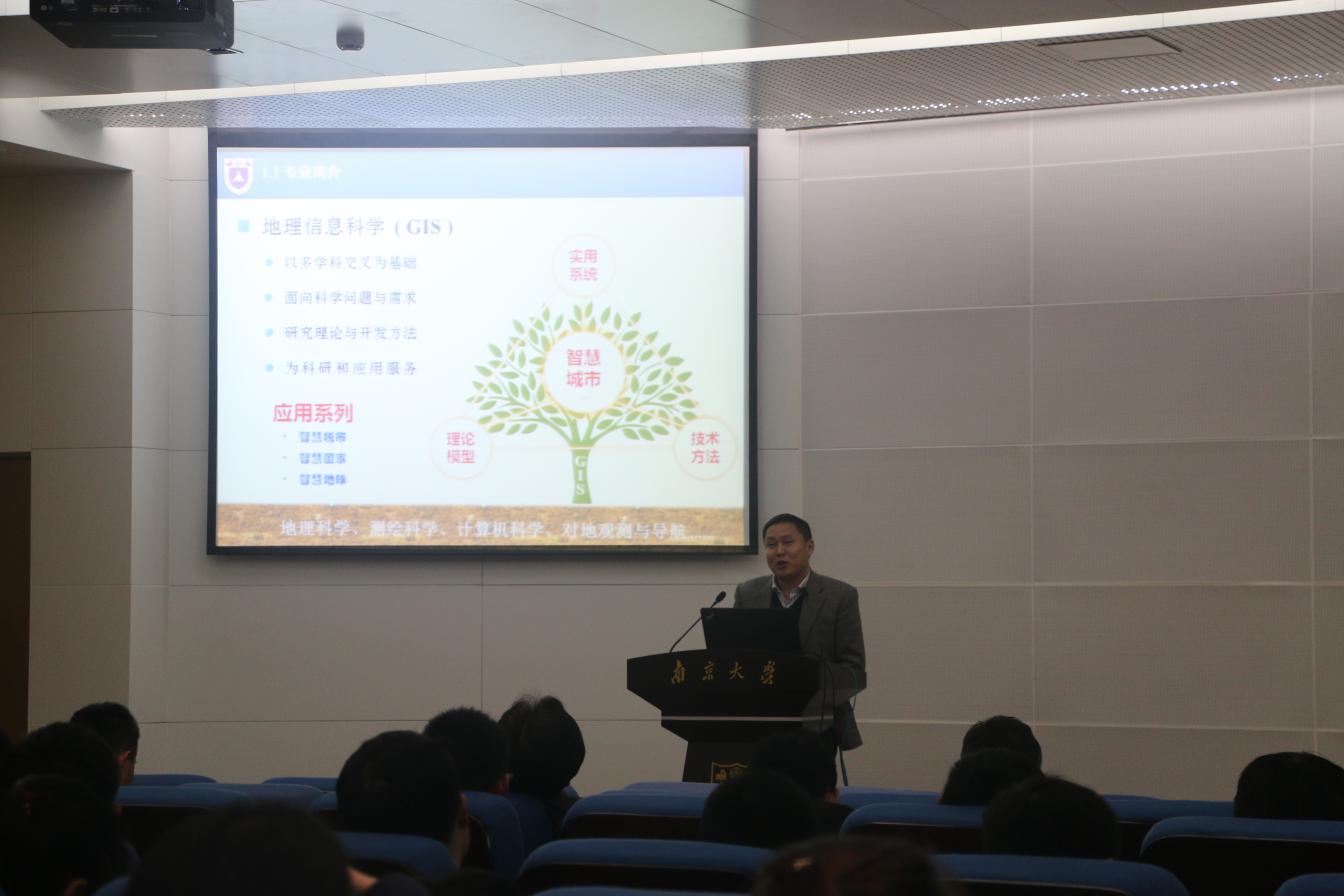 鹿化煜院长代表地理科学专业首先发言,他首先对在座的同学们表达了自己殷切期待,鼓励同学们做未来世界的主人。院长指出地理科学是一门伟大的科学,地理学院也是一个学习的好处所。就基地班而言,高保研率(本校、外校保研)和出国留学是其最明显优势,基本实现“人人都可深造”;其次,对基础教育的高重视、基础课程的高要求,对个人的知识框架构建意义重大;基地班的选择面广、师资力量雄厚,同学们完全可以对未来充满信心。