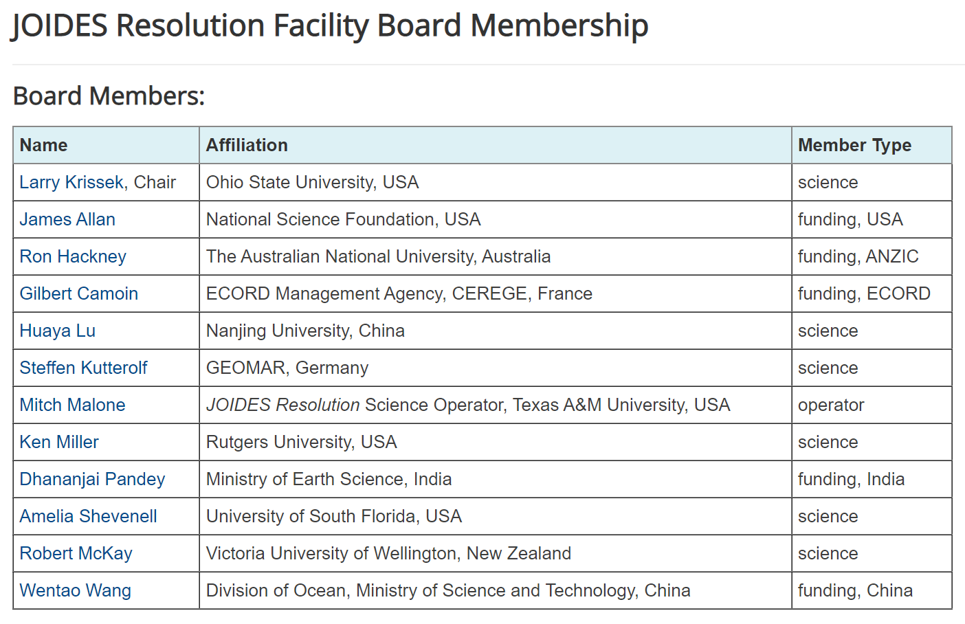 表1 国际大洋发现计划平台管理委员会科学委员名单 (引自IODP 网站) (//www.iodp.org/program-organization/joides-resolution-facility-board-membership)