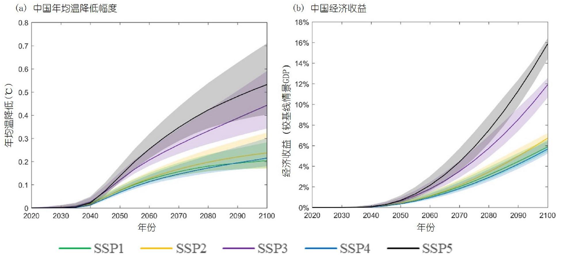 (a) 各个SSP路径下中国年均温降低的幅度; (b) 各个SSP路径下中国降低温度所产生的经济收益. 两图中阴影为基于温度不确定性的95%置信区间