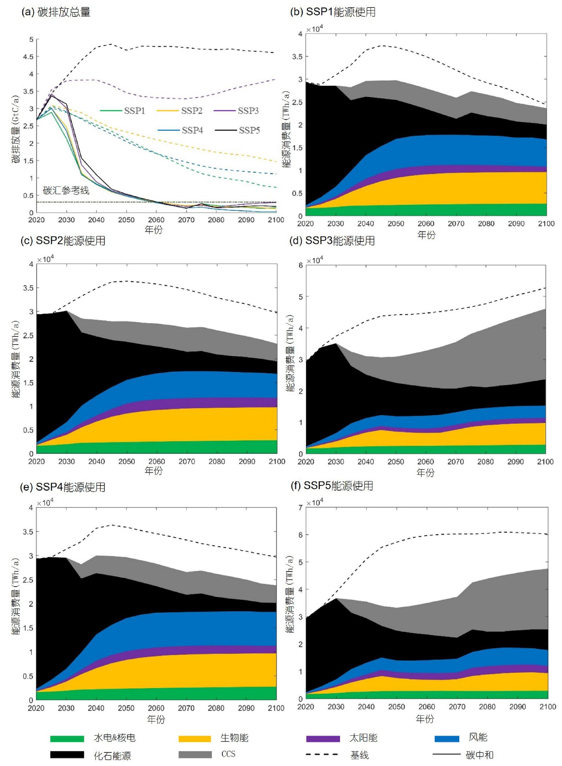 (a) 基线情景与碳中和政策情景下碳排放变化, 点划线为碳汇估计量; (b-f) 碳中和政策下各情景能源结构