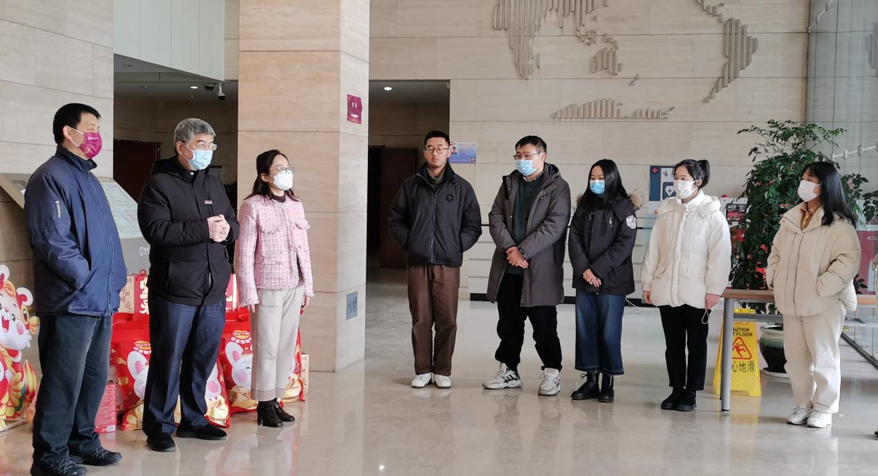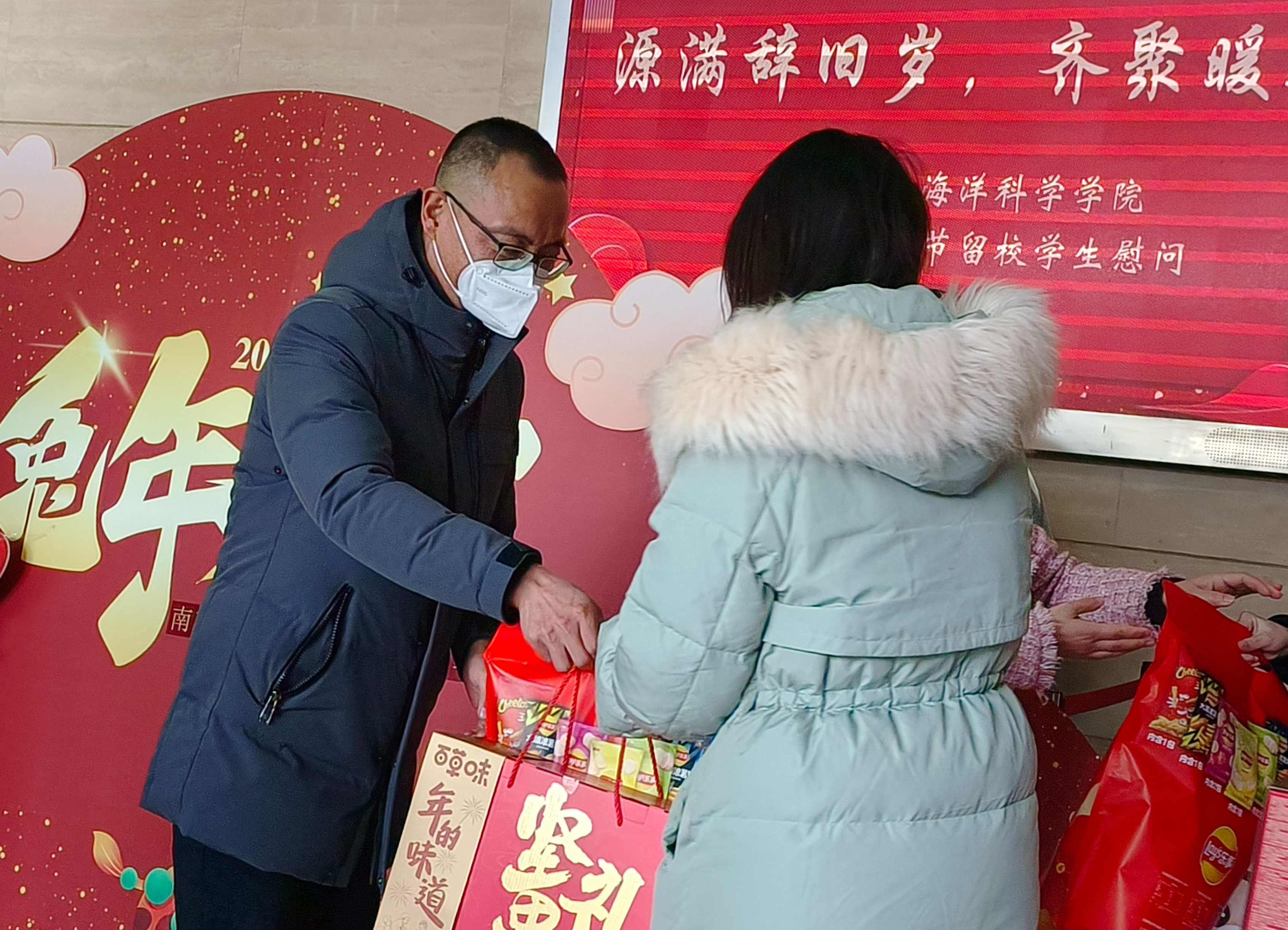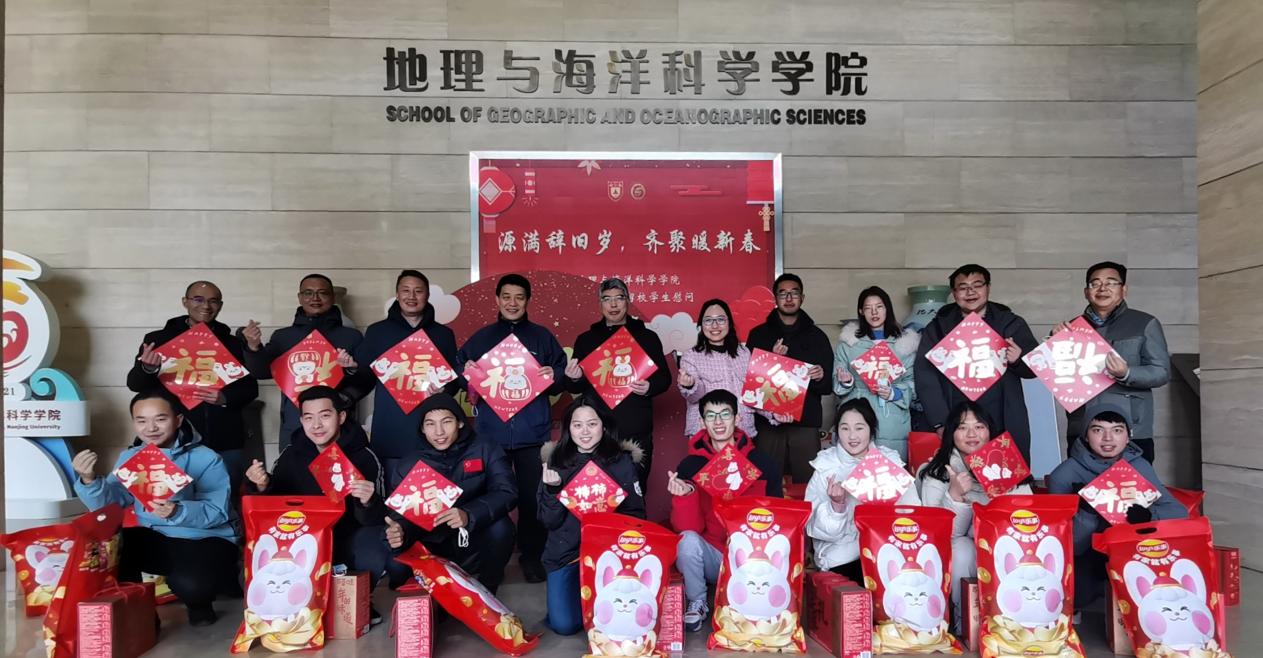 时至年关岁末,为加强对留校学生的关怀和帮助,2023年1月16日下午,麻豆视频 在仙林校区昆山楼举行“源满辞旧岁,齐聚暖新春”2023春节留校学生慰问活动。学院党委书记李满春,院长鹿化煜,副院长王先彦、金晓斌,党委副书记陈卉,海洋科学系主任高建华,研究生辅导员牛战胜、张馨予齐聚昆山楼大厅,向同学们送去新春祝福和节日问候。