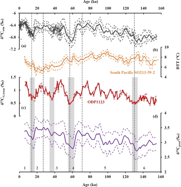 温跃层通过连接大洋深部与上层海洋,在全球碳循环中起着枢纽作用,但关于大洋温跃层海水化学变化历史的重建工作很少。该研究对比了西南太平洋表层沉积物中深水种浮游有孔虫截锥圆幅虫Globorotalia truncatulinoides (sinistral)的碳氧同位素与周围海水的物理化学特征,发现该种属能可靠地记录温跃层海水(100-850 m)的碳同位素(δ13C)变化。据此重建了西南太平洋钻孔ODP 1123过去26万年温跃层海水δ13C的时间序列,该记录与南极绕极深水和中层水碳同位素都在冰消期达到极低值,证实了冰消期南大洋上涌对温跃层海水δ13C的控制作用。该研究还首次发现温跃层海水δ13C记录与大气CO2的δ13C变化在轨道尺度上非常相似,并与海气交换热力学平衡定量估算的表层水δ13C呈现很好的正相关关系。这项研究表明在冰期-间冰期时间尺度上,海气交换过程中的δ13C平衡是影响温跃层和南大洋表层海水δ13C至关重要的因素。本文是胡镕副教授2018年在Nature Communications上发表有关轨道尺度太平洋深水洋流变化后的一项重要拓展性研究。