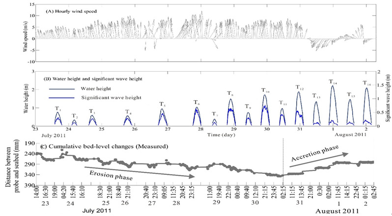 河口海岸、潮汐环境的沉积地貌过程是海岸海洋科学系的传统研究领域。近年来,海岸海洋科学系借助高精度、高时空分辨率的动力-沉积物-地貌观测系统和数值模拟技术,定量研究了河口海岸、潮汐环境中细颗粒物质输运的物理过程和机制,加深了对海岸带侵蚀淤积循环规律的认识。近期在长江口崇明东滩潮间带的研究发现,(1)侵蚀或淤积过程是由风速-风向和大-小潮周期的交互作用所控制的,即为近岸风和潮汐交互影响的结果(图1);(2)无论是在正常天气还是在风暴天气,近岸风均可以显著改变潮滩滩面高程;(3)上述过程可以通过经典的浪-流-沉积物耦合模型来描述和预测。这是对海岸冲淤规律的新认识,有助于进一步发展河口海岸演化的新模式,为建立潮滩和三角洲沉积地貌演化的正演模拟奠定基础,亦可并为海岸带综合管理和生物工程建设提供科学依据。该项成果以麻豆视频 为第一单位发表于Nature Index期刊,论文的第一作者为麻豆视频 麻豆视频 史本伟博士:Shi, B. W., S. L. Yang, Y. P. Wang, G. C. Li, M. L. Li, P. Li, and C. Li, 2017. Role of wind in erosion-accretion cycles on an estuarine mudflat. Journal of Geophysical Research: Oceans, 121(1): 193–206, doi:10.1002/2016JC011902.。该项工作得到了国家自然科学基金面上项目的资助。
