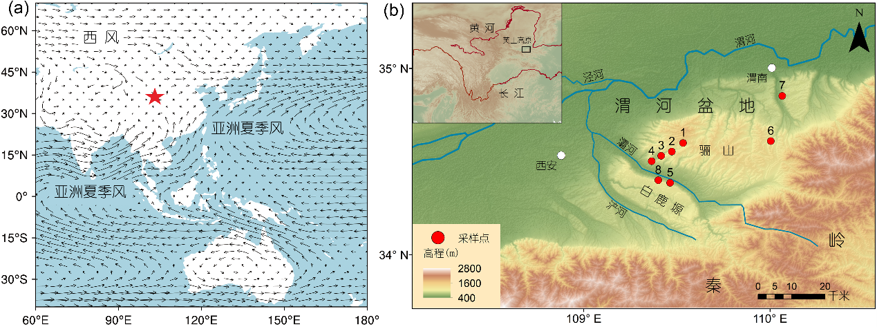 图1. 渭河流域工作地点图。1a 渭河流域在亚洲季风环流中的位置(五角星指示渭河盆地);1b 渭河盆地蓝田地区采样点(红色实心圆)。