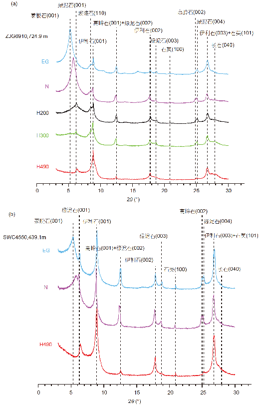 图 3. 渭河盆地新生代沉积序列黏土矿物样品定向片X射线衍射分析 (XRD)谱. (a) 含坡缕石样品; (b) 不含坡缕石样品.