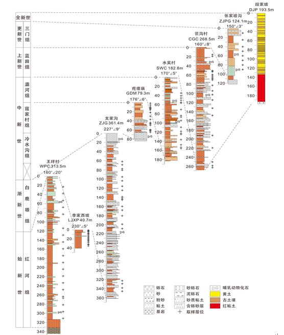 图2. 渭河盆地连续的新生代沉积序列及黏土矿物研究分析采样层位(黑色加号)