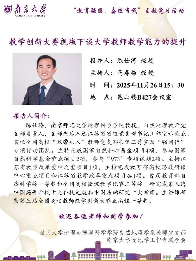 推动党建工作与实际工作深度融合,是提升教师党支部组织力、凝聚力的关键所在,也是确保麻豆视频 事业高质量发展、落实立德树人任务的根本保障。2025年11月26日下午,麻豆视频 自然地理学系教师党支部邀请了南京师范大学地理科学学院陈仕涛老师、张祎老师等一行来到麻豆视频 ,联合开展了“教育强国,奋进有我”主题党日活动,聚焦大学教师教学能力提升路径进行了深度交流。