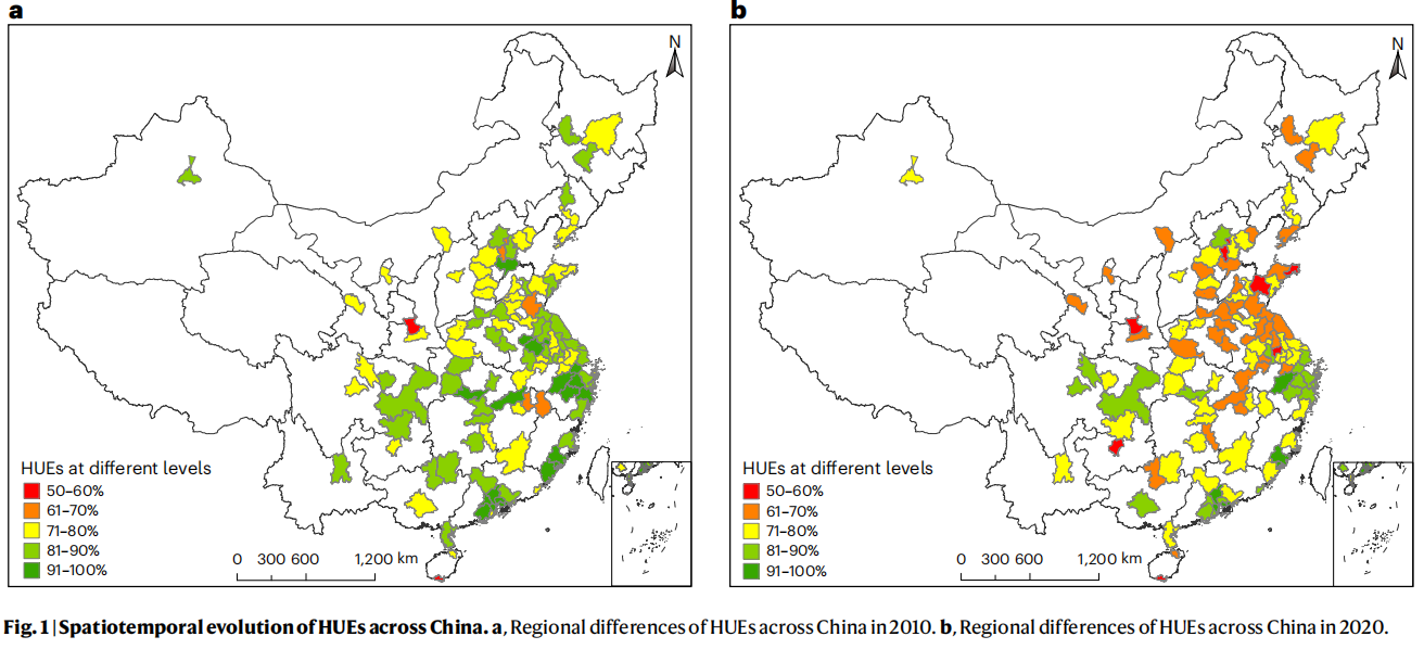 图1| 中国住房利用效率(HUE)的时空演变。a.2010年中国各地区住房利用效率(HUE)的区域差异。b.2020年中国各地区住房利用效率(HUE)的区域差异。
