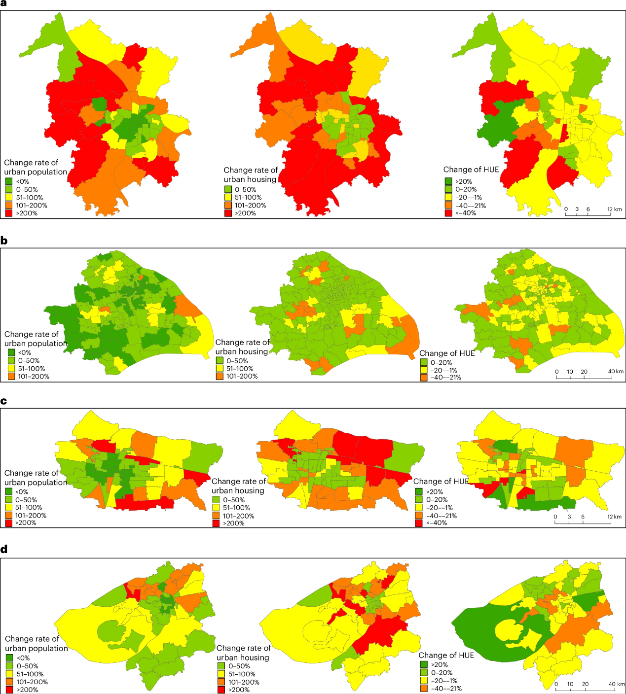 图3| 四个典型城市的内城区详细示意。a–d.2010年到2020年间,四个代表性城市下辖区的城市人口和住房变化率,以及住房利用效率(HUE)的变化:长沙(a)、上海(b)、石家庄(c)和苏州(d)。