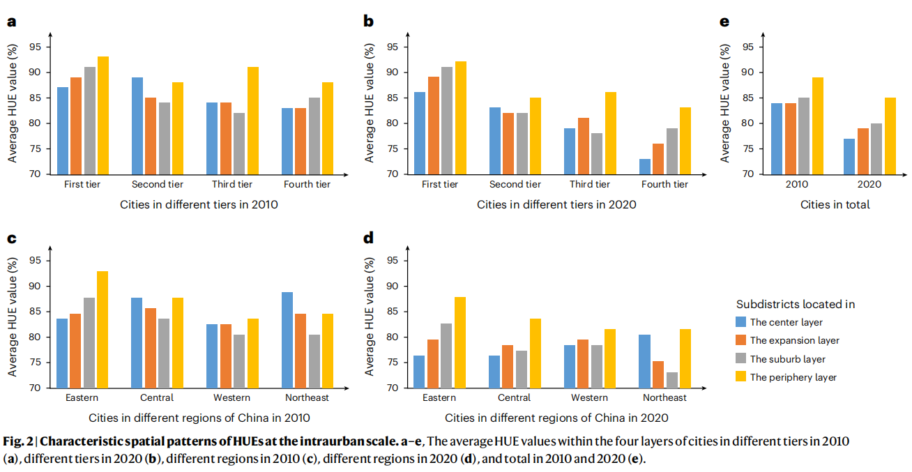 图2| 城市内部尺度住房利用效率(HUE)的特色空间模式。a–e.不同层级城市2010年(a)和2020年(b)内的平均住房利用效率(HUE)值;不同地区2010年(c)和2020年(d)内的平均住房利用效率(HUE)值;2010年和2020年的总体住房利用效率(HUE)值(e)。