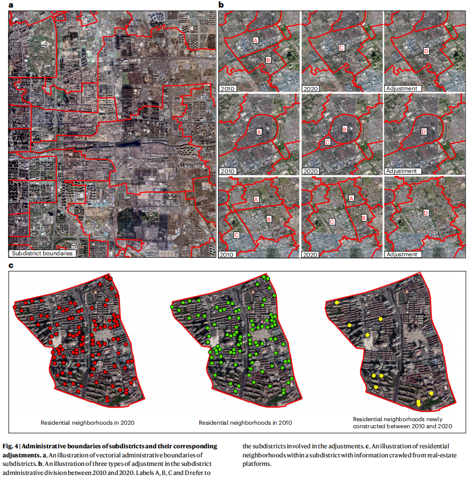 图4| 辖区行政边界及其相应调整。a.辖区区的矢量行政边界示意图。b.2010年到2020年期间,辖区行政划分中的三种调整类型示意图。标签A、B、C和D分别表示涉及调整的辖区。c.从房地产平台抓取信息的辖区内住宅小区示意图。