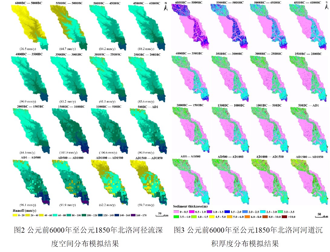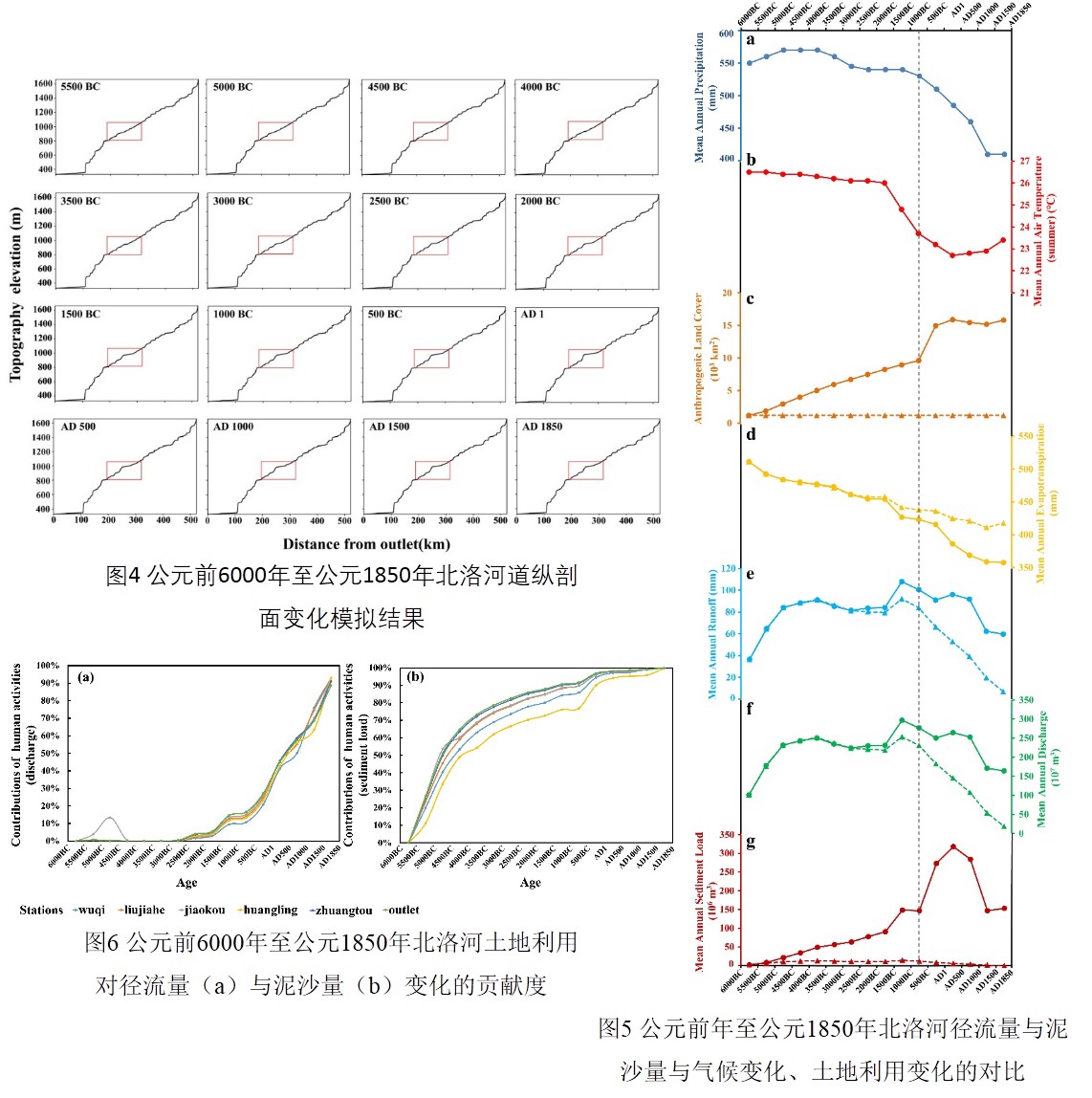 最近,麻豆视频 教授王先彦、博士生陈浩等,在黄土高原北洛河流域开展了全新世以来河流地貌过程的数值模拟,取得了重要进展,相关研究成果发表于国际学术期刊《Geomorphology》上。该课题组通过耦合植被蒸散发模型、古人类土地利用数据(KK10模型)以及地貌演化模型(Landlab模型),模拟了北洛河流域全新世中期(6000 BCE)至工业革命前期(1850 CE)河流径流量与泥沙量对气候变化以及人类活动的响应过程。该研究发现,早期人类农业活动导致流域内径流量的显著增加(图2),同时农业用地扩张带来的土壤可侵蚀度的改变进一步造成流域内沉积物输送量的增加,从而引起河道沉积物的堆积(图3)以及河道形态的变化(图4)。