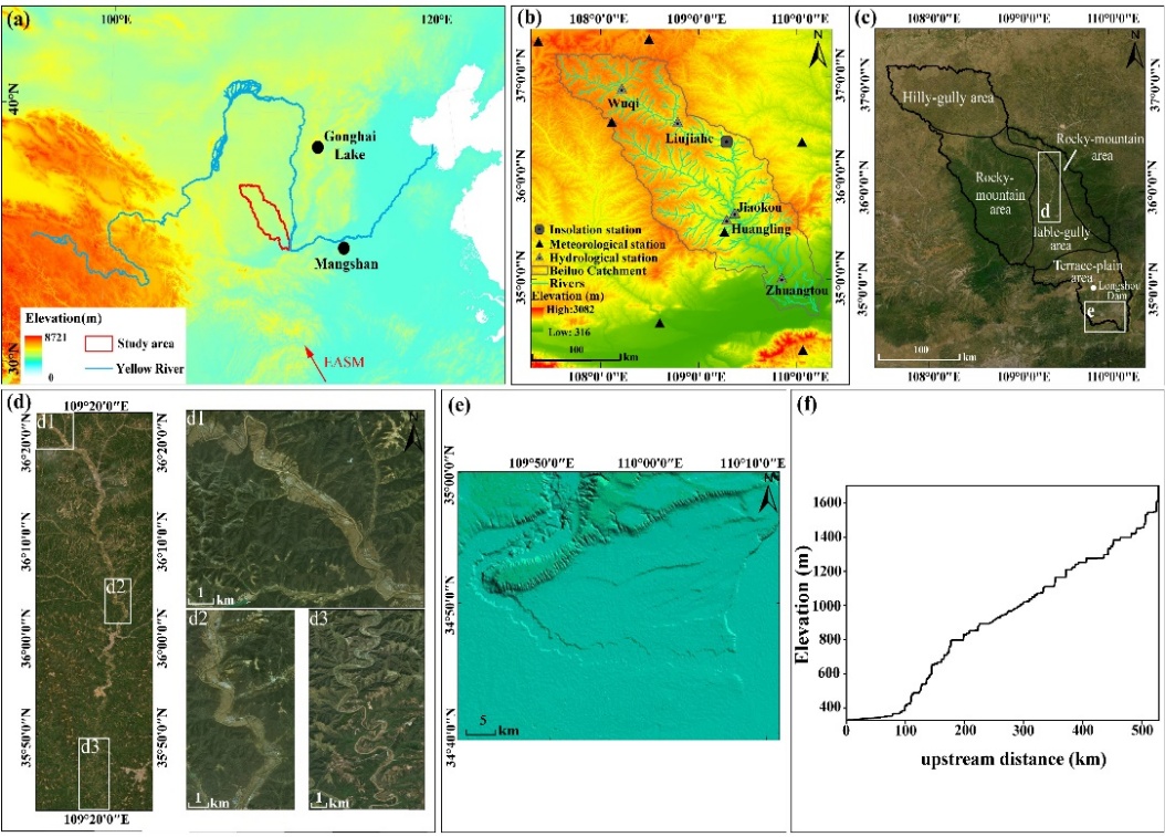 图1 (a)黄土高原北洛河区位图;(b)北洛河气象、水文站点以及河流水系分布图;(c)北洛河地貌单元遥感卫相图;(d)北洛河中游河漫滩遥感卫相图;(e)北洛河下游阶地分布图;(f)北洛河干流河道纵剖面分布图