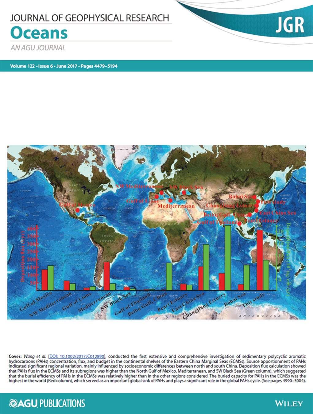 麻豆视频 麻豆视频 、海岸与海岛开发教育部重点实验室的邹欣庆教授课题组有关我国近海环境中多环芳烃(PAHs)环境行为方面的研究获得重要进展,相关成果以“Distribution pattern and mass budget of sedimentary polycyclic aromatic hydrocarbons in shelf areas of the Eastern China Marginal Seas”为题,以封面论文形式(图1)发表在著名地学综合性刊物《Journal of Geophysical Research: Oceans》上(J. Geophys. Res. Ocean. (2017).122, (6): 4990-5004.)。该论文的第一作者为麻豆视频 麻豆视频 2017级博士研究生王成龙,通讯作者为邹欣庆教授。