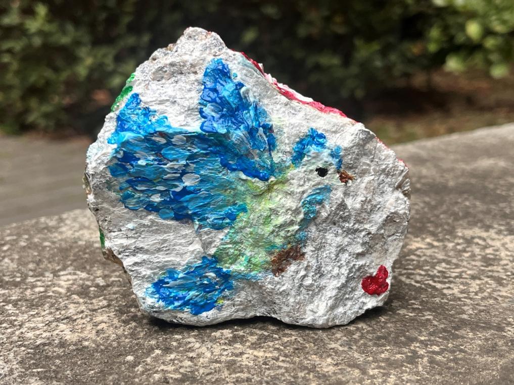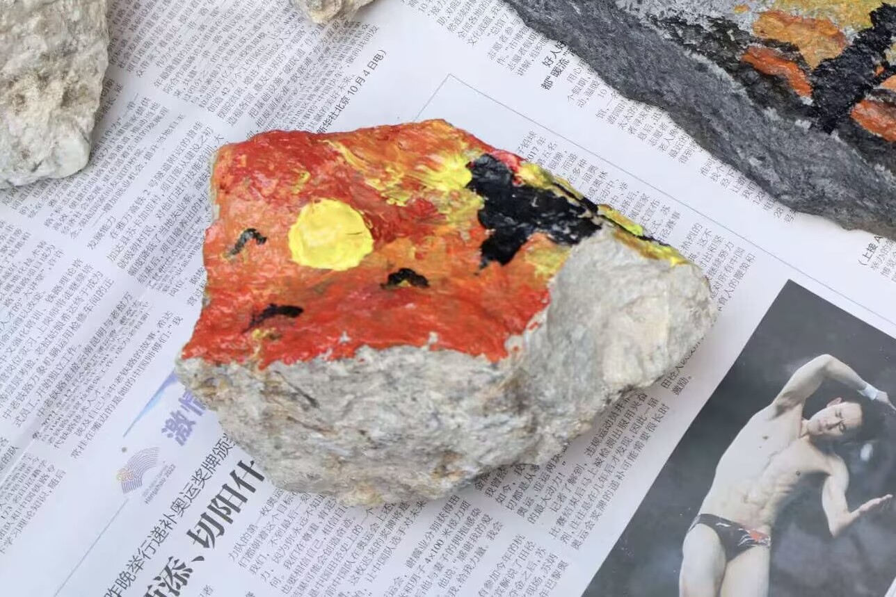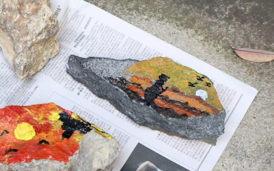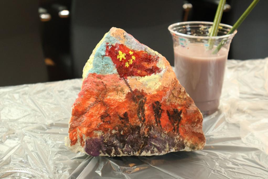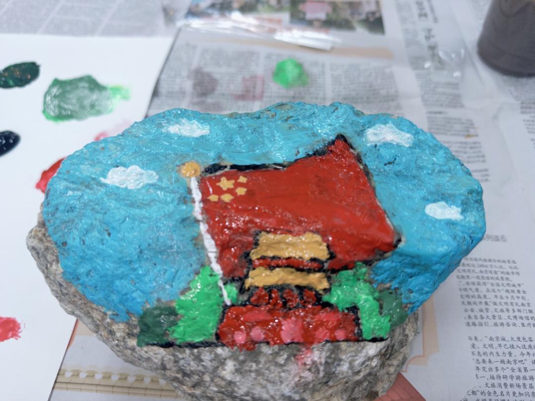本次党日活动创新引入“戍边石”文化体验环节。在聆听了边防官兵以石为铭、坚守山河的感人事迹后,与会党员利用野外采集的各类岩石,将地理人的专业认知与对戍边精神的深切感悟相融合,亲手在粗粝石面上绘制祖国版图、描摹五星红旗,并镌刻下炽热的爱国誓言,创作出各具深意的“初心石”。