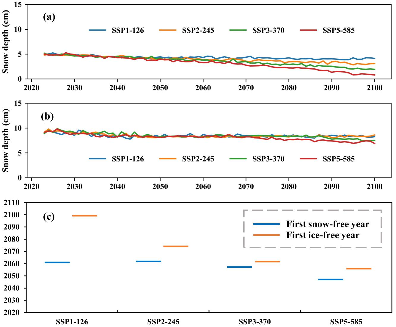 图1. 2023-2100年四种排放情景下(a)暖季和(b)冷季的北极平均积雪深度,以及(c)预测的第一个无雪和无冰年份