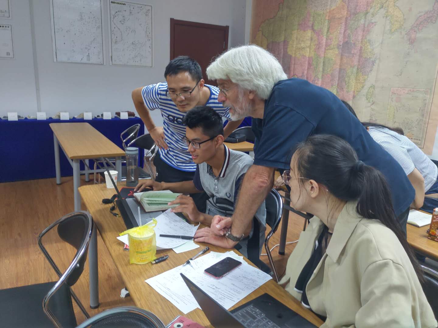 9月4日下午,围绕上午两场报告的主要内容,De Lange教授让学生两两分组,完成三个部分的练习以巩固自己对海洋沉积物特征的理解。第一部分的练习是关于Fe及U元素在海洋中的停留时间;第二部分的练习是关于有机质在海洋中的生产及保存;第三部分的练习是关于沉积物中元素含量作图分析。在这三部分的练习中,De Lange教授先给予一定的时间让学生两两交流探讨,形成解题思路,而后对每一个小组分别进行指导。在与De Lange教授的学习交流中,同学们积极思考,给出有效的回答,得到了De Lange教授的肯定,同时自己也受益匪浅。研讨会结束后,De Lange教授与与会同学合影留念。