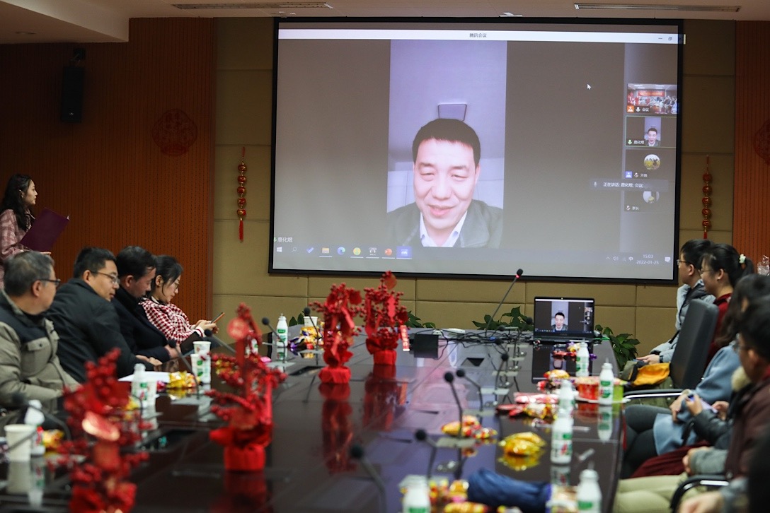随后,留校学生们依次发言,其乐融融,老师们热切关怀了家在西安、河南等地的同学,并为同学们送上新年祝福。2018级博士生陆福志谈及自己高考的故事以及多次在校过年的经历,感谢学院领导及老师对学生留校过年期间的贴心关怀。本科生高滢的家乡在新疆伊宁,今年因疫情无法回家过年,这也是她第一次在外地过年。高滢的父母在线收看了活动直播,在现场连线环节中,她的父母一再对学校、学院给予女儿的关心表示感激,并给在场的同学们都送上了真切的新年祝福。
