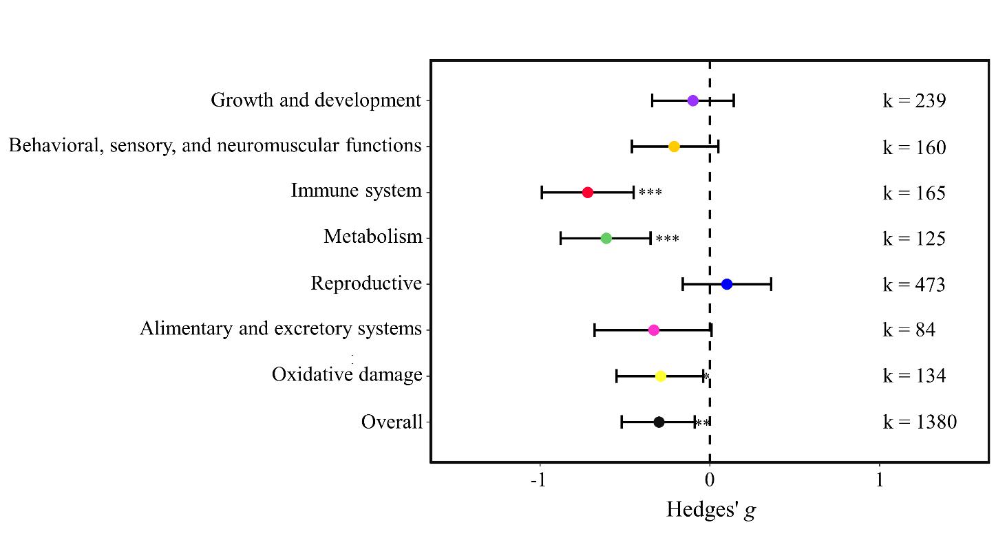 在此背景下,麻豆视频 邹欣庆教授团队选择鱼类为目标研究对象,溶解态为污染物存在形式,进行了一项荟萃分析,定量总结全球文献中现有的实验证据,并使用效应大小估计器来确定毒性的变化(方向和大小)以及对生物功能和系统的影响。研究发现在环境MP浓度的背景下,共存污染物溶液中MP的存在显著增加了对鱼类的毒性,具体而言,MPs会增加对免疫系统、代谢和氧化损伤的负面影响,但对生长和发育、行为和感觉及神经肌肉功能、消化和排泄系统、繁殖没有显著影响(图2)。此外,通过亚组/元回归分析探讨可能影响毒性的因素,发现毒性的变化与鱼类的生长阶段和MP大小有关,但与共存污染物类型、MP类型、有机污染物的logKow、暴露时间无关(图3)。最后,从MPs、共存污染物、环境因素和实验对象四个方面讨论了实验室研究与实际水生环境的差异,这些差异可能会影响评估的准确性。本研究为从复合污染的角度进一步了解MPs对水生生物的潜在影响提供了基础。此外,鉴于污染是渔业资源减少的重要因素,本研究可以为水生生态系统的保护和管理提供参考。