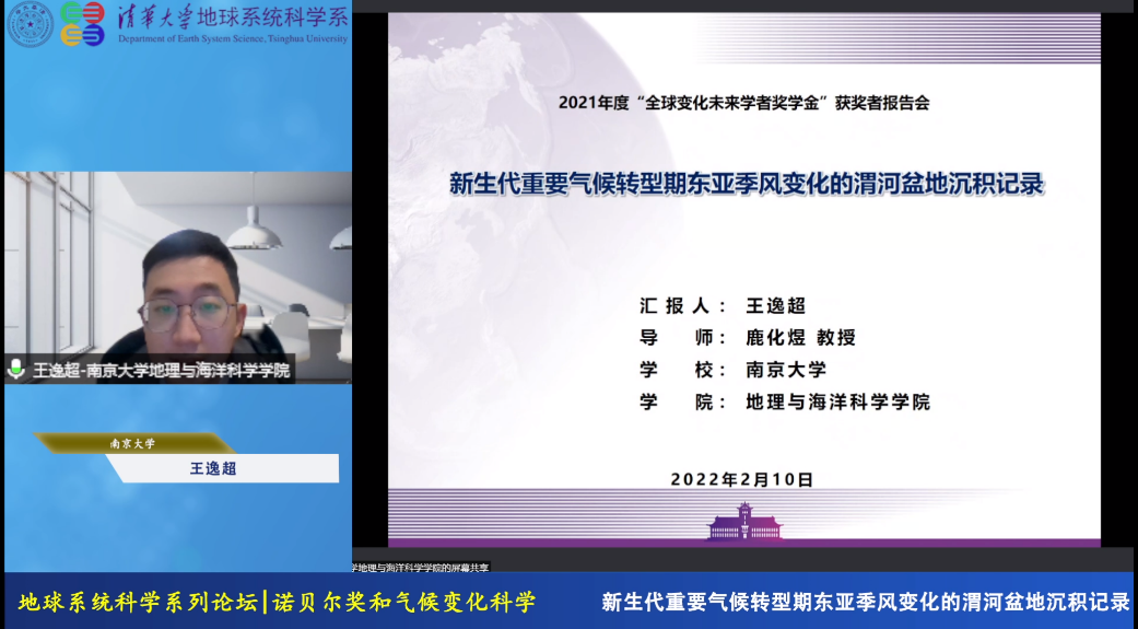 2022年2月10日,清华大学地球系统科学系、清华大学全球变化研究院以在线方式举办了“地球系统科学论坛:诺贝尔奖和气候变化科学暨2021年度全球变化未来学者奖学金颁奖典礼”活动。经过提名推荐、资格审查、专家评审、管委会终审,麻豆视频 博士研究生王逸超同学与来自清华大学、北京师范大学、中国科学院植物研究所的四位同学获得了首届“全球变化未来学者奖学金”。活动期间,王逸超同学作题为《新生代重要气候转型期东亚季风变化的渭河盆地沉积记录》的获奖汇报,他回顾了自2014年参加麻豆视频 本科生创新训练项目以来,师从麻豆视频 鹿化煜教授在渭河盆地开展野外考察和实验分析的学习和科研经历,并简要介绍了目前的研究进展。