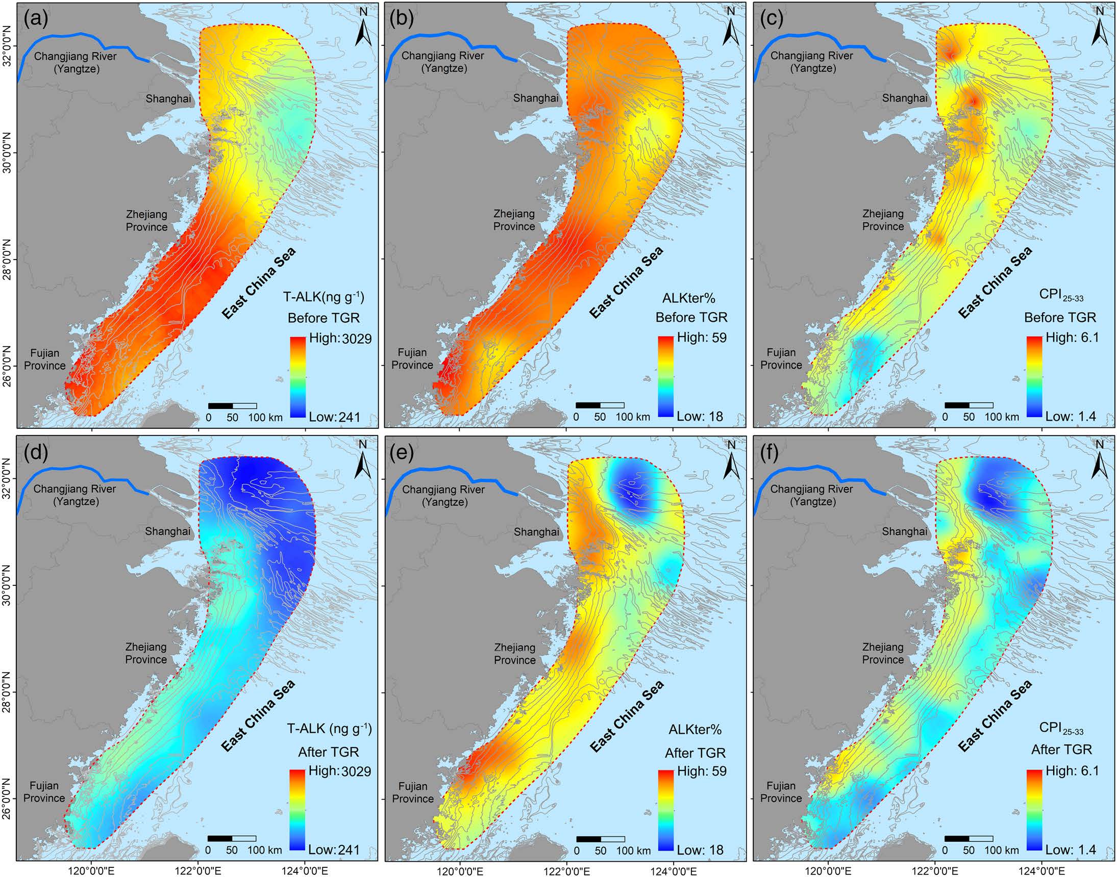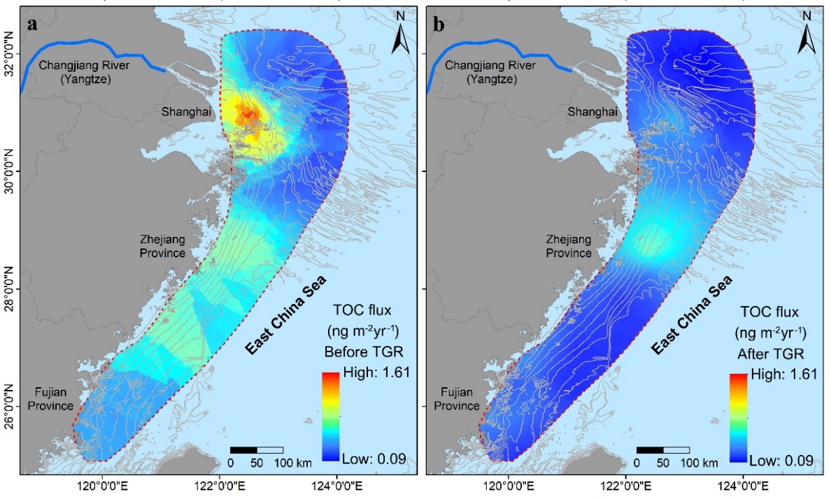 我国东海属于典型的受大河影响的陆架边缘海,长江每年向其输送大量颗粒有机质。巨量陆源物质入海后在长江河口-陆架区形成典型的泥质沉积体,为颗粒有机质提供了良好的埋藏场所。随着流域工程活动不断加剧,长江入海泥沙通量显著减少,并导致长江河口-陆架区的底床沉积物发生再分配,从而可能影响颗粒有机质的输运和沉积过程。麻豆视频 邹欣庆教授团队,围绕这一问题,开展了全面深入的研究,取得了一系列新进展。近期,他们在国外重要学术刊物Geophysical Research Letters, Water Research, Journal of Geophysical Research: Oceans等发表多篇论文,论证流域工程影响下长江河口-陆架区沉积有机质的时空分布变化及其响应机制。