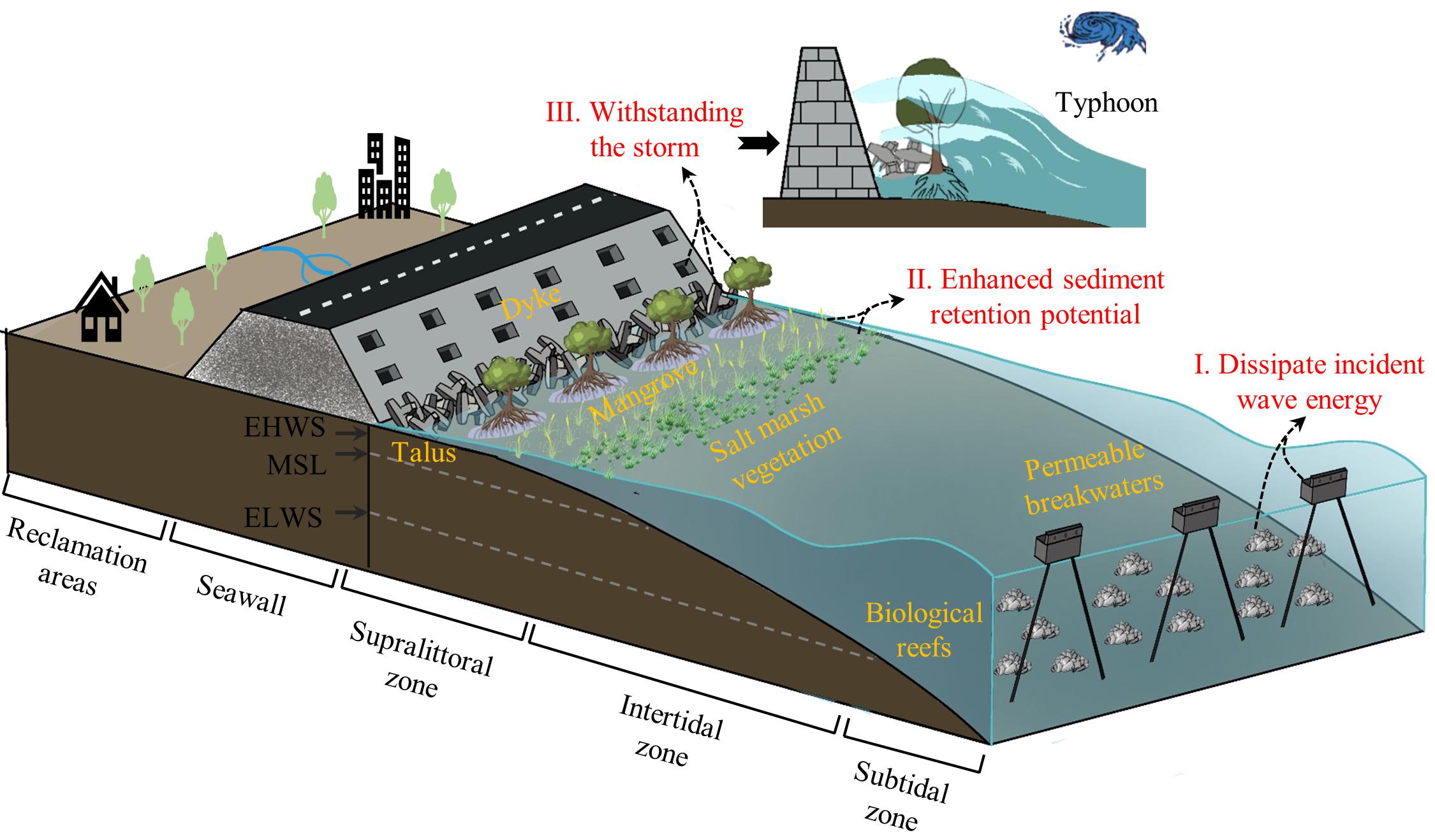 针对江苏海岸目前正在发生自北向南侵蚀的格局,主张制定多功能协调、多层次防护的海岸保护策略,重点是抑制波浪、增强沉积物滞留,采取对潮滩由海向陆的阶梯式防护策略(图4),提高极端天气事件、风暴浪冲刷的抵抗能力。这一防护模式考虑了潮滩海岸地貌状态转换的主控机制,为全球滨海湿地的保护提供一种近自然的海岸防护模式。