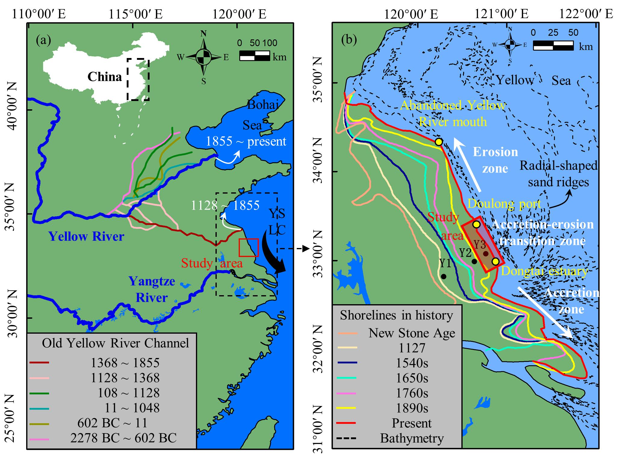 图1 黄河改道及江苏海岸概况。图1a为黄河历次改道及研究区地理位置示意图,图1b为江苏海岸线历史变迁、目前江苏沿岸侵蚀-淤积格局及数据采集区域。