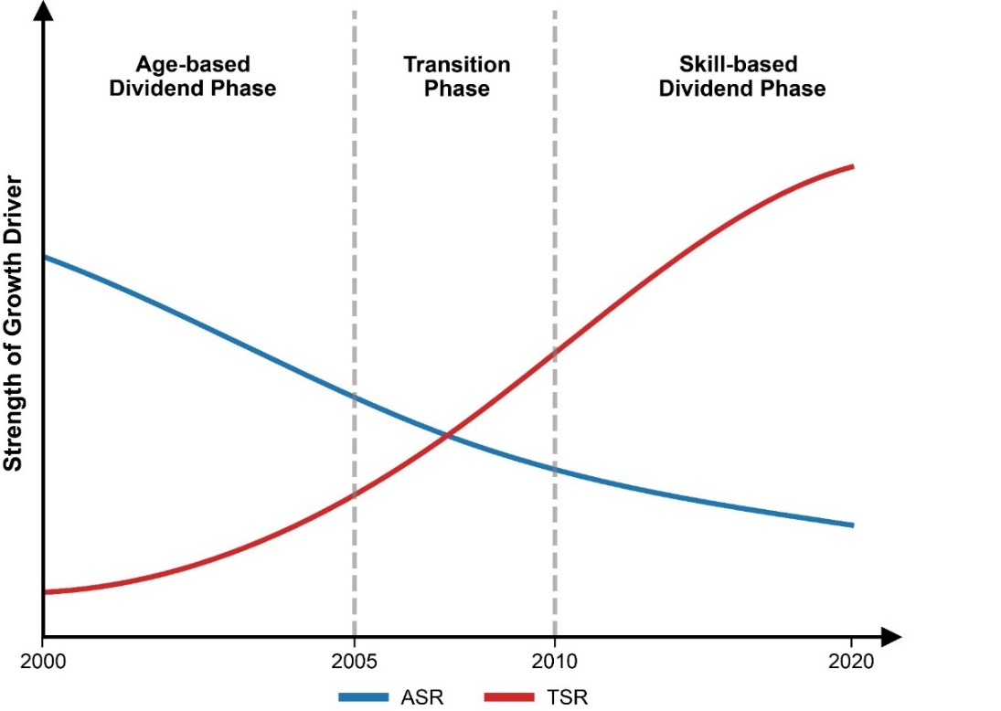 最后,研究团队基于联合国的低生育率(Low variant)方案,构建了2025—2100年应对ASR变化的人才红利预测模型。结果表明,延迟退休能够短期扩大劳动力供给,预期在2030—2040年之间创造出人口结构调整窗口期。然而,单纯调整劳动力供给仅能提供暂时的缓冲,实现TSR的持续增长是有效推动经济繁荣的根本举措(图4)。
