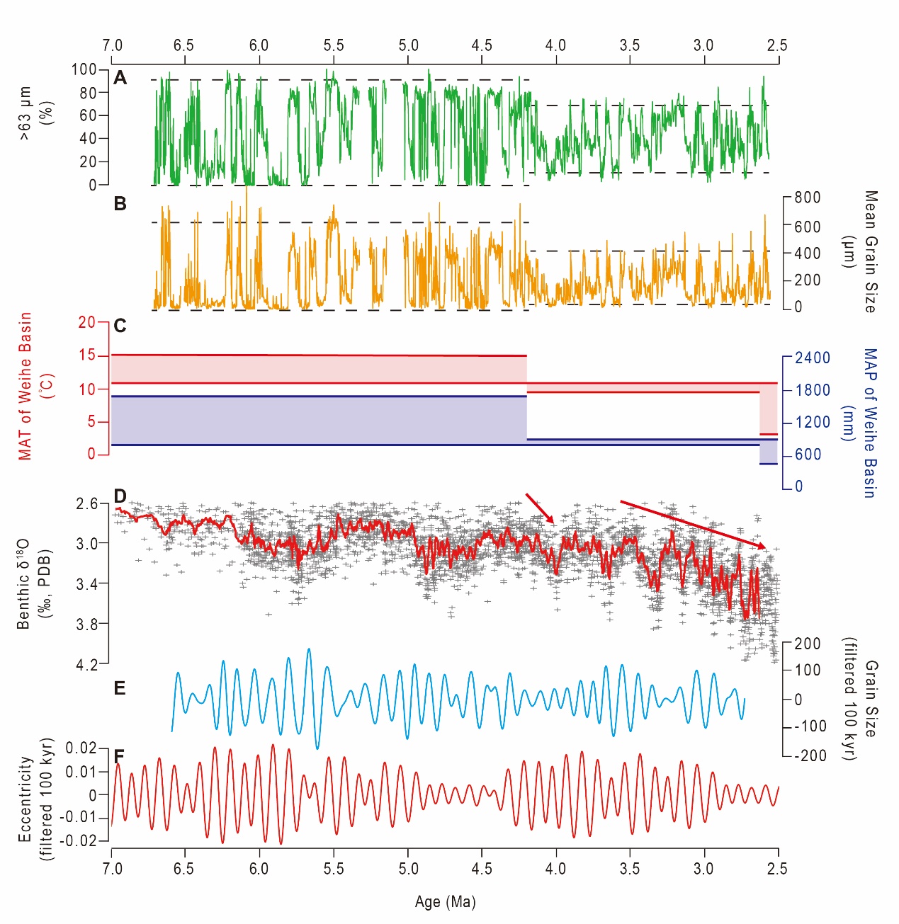 揭示气候长期演变的规律和影响因素,仪器观测时间偏短,需要从自然界的“档案记录”中找到这一问题的答案。鹿化煜课题组通过对陕西中部渭河盆地的长期考察研究,他们在陕西省渭南市阳郭镇一带,发现了很好的河湖相沉积序列 (图1)。他们通过对这些沉积物详细的地层研究、古地磁定年和哺乳动物化石分析,确认这些沉积物堆积在距今约6-2百万年前,正好处在地球较为温暖的上新世阶段。这些沉积物由流水携带沉积在盆地中,在流水量大流水强度强的时期,携带来的沉积物颗粒粗;反之,沉积物颗粒细。基于这一原理,他们分析了沉积序列中近3000份样品的颗粒大小分布,发现粒度时间序列在距今4.2百万年前有明显转型(图2);周期分析表明,粒度时间序列具有地球运动轨道周期的特征,表明高纬和低纬地区接受的太阳辐射量变化,都能影响到季风降水的长期变化。研究的时间段处于上新世温暖期,这一成果对于理解未来气候变化、全球变暖背景下东亚季风气候的数值模拟等,均具有重要意义。