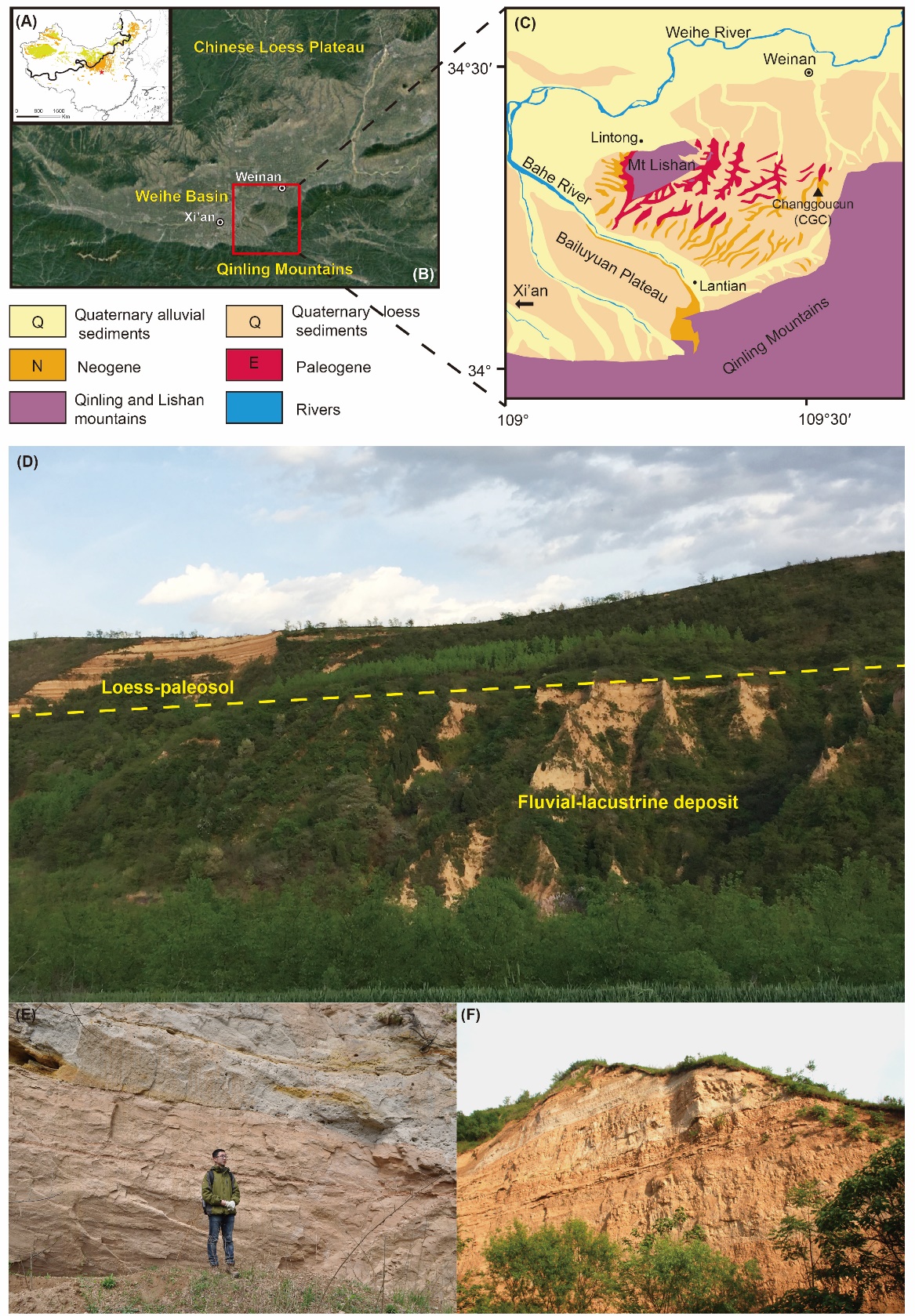 图1. 研究点区位和沉积序列剖面。图1A,1B和1C是陕西省渭南市阳郭镇苌沟村地点;图1D, 1E和1F是发现的河湖相沉积序列和黄土-古土壤序列。