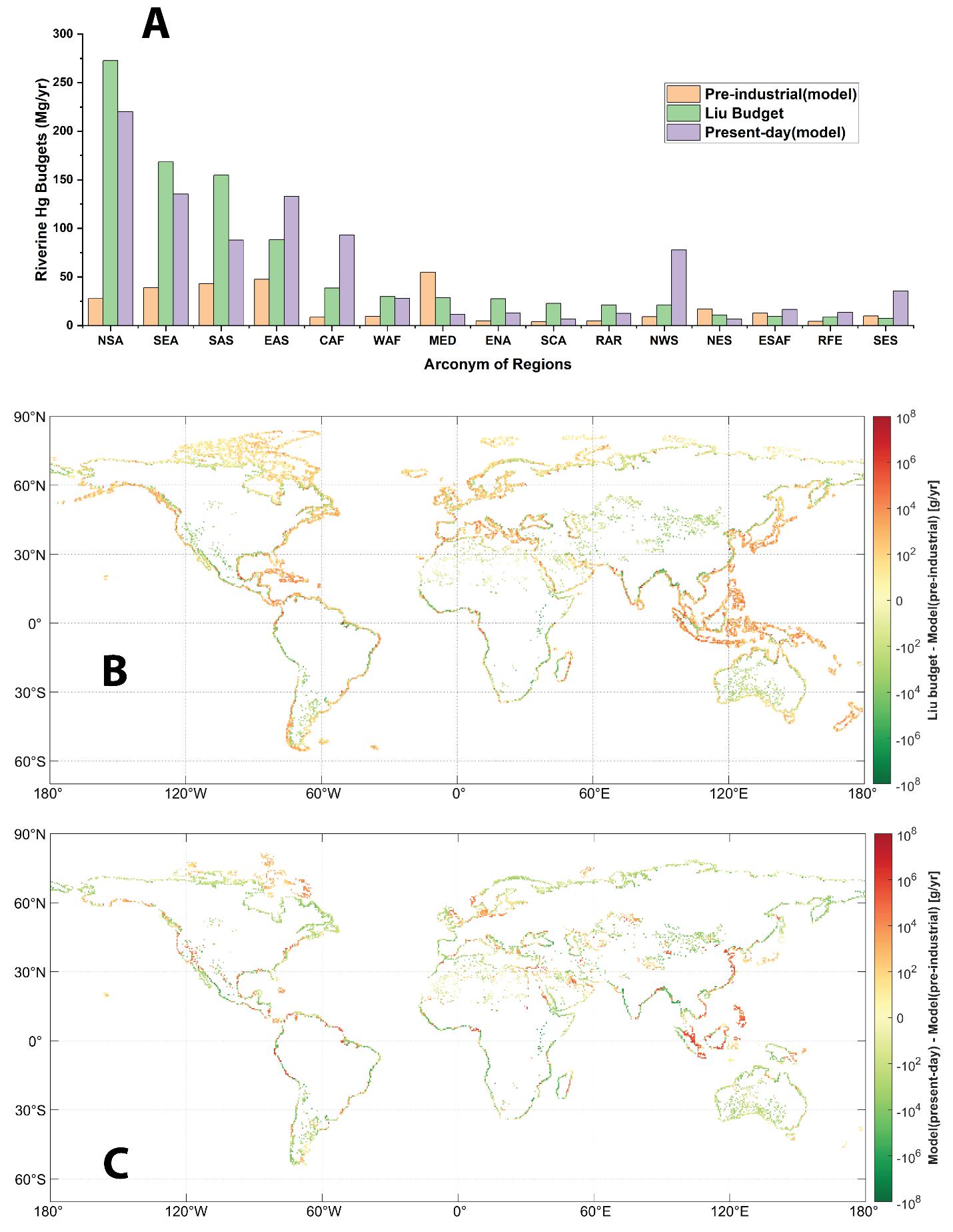 汞化合物是一类强效的神经毒素,主要通过食用鱼类威胁人类健康。河流不仅是饮用水和食物的重要来源,自工业革命(约1850年)以来,其汞浓度和向沿海地区的输出量也显著上升。然而,这一变化的时空格局尚未被系统研究,限制了对相关环境政策成效的评估。近日,麻豆视频 麻豆视频 与大气科学学院联合课题组于国际刊物Science Advances发表题为“Human perturbations to mercury in global rivers”的研究论文。该文基于地球系统模式CESM2与E3SM开发全球河流汞模型,采用工业前时期气象驱动场来模拟工业前时期的河流总汞通量,并通过与现代观测估算和模拟进行深入对比,系统量化了近现代人类活动对河流汞循环的扰动。
