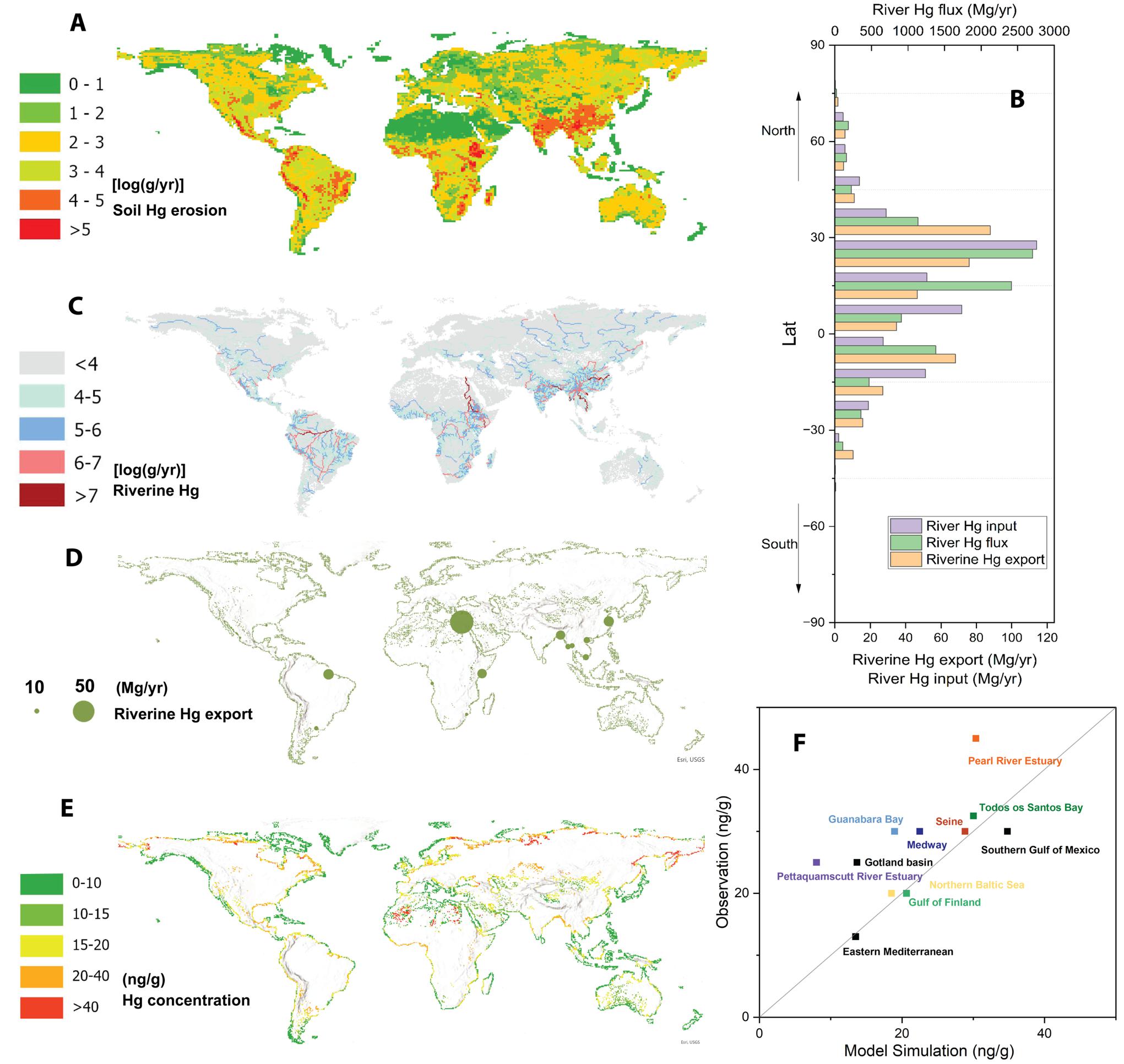 研究结果表明,在工业前时期,全球河流每年向海洋输送约390 Mg/yr(等同于吨/年)的汞,且存在显著的区域差异。热带和亚热带地区(30°N–30°S)因强降水和高地地貌特征,具有更高的汞侵蚀通量。泛喜马拉雅区域尤其显著,是河流土壤汞输入的最重要源区。亚洲的主要大河,如长江、黄河和雅鲁藏布江,因其强烈的侵蚀能力,是近现代向海洋输出汞的关键通道。全球多处高原和山区(如安第斯山、东非高原、巴西高原等)因地形陡峭和流域面积大,造成高汞侵蚀通量。特别是在靠海的山区河流中,洪水可在短时间内将大量汞快速输送到海岸。这类快速事件往往难以监测,导致其在全球汞循环中的重要性被低估。