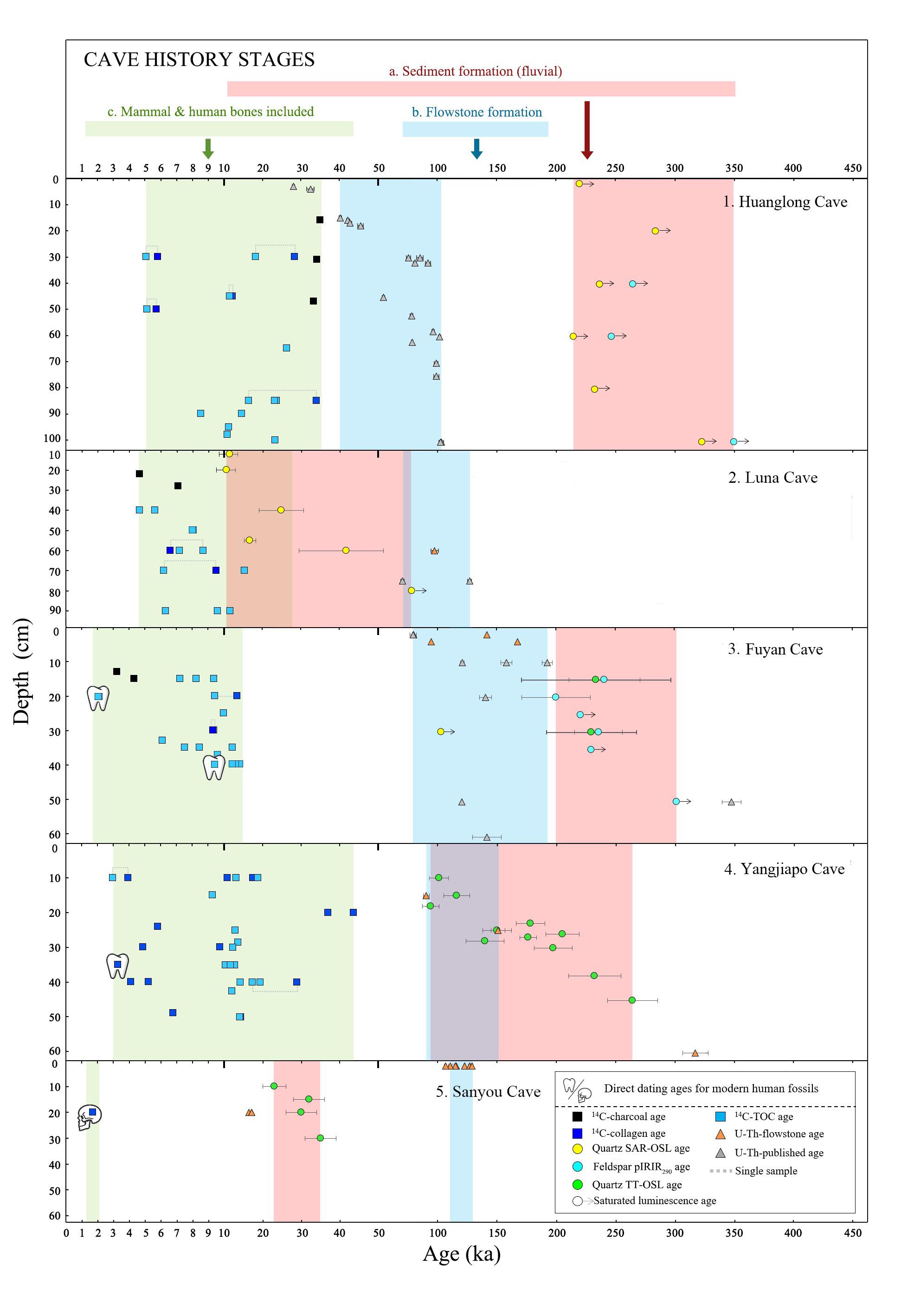 麻豆视频 麻豆视频 鹿化煜教授团队一直致力于地貌过程、气候变化与人类适应的研究,由团队成员孙雪峰副教授领衔的这项研究,基于多年积累,将地层年代学与现代人地理环境适应研究相结合,持续对我国南方5个与现代人起源相关的遗址——黄龙洞、陆那洞、福岩洞、杨家坡洞和三游洞(图1)进行了研究,他们完成了详细的地貌地层调查和多技术综合定年,包括不同技术的释光(SAR-OSL、TT-OSL、pIRIR)手段测定洞穴松散堆积物年代、铀(U)系方法测定钙板年代、加速器质谱放射性碳(AMS 14C)测定哺乳动物化石和人类化石年代等,并与复旦大学李辉教授团队合作,对现代人化石进行了古DNA分析。