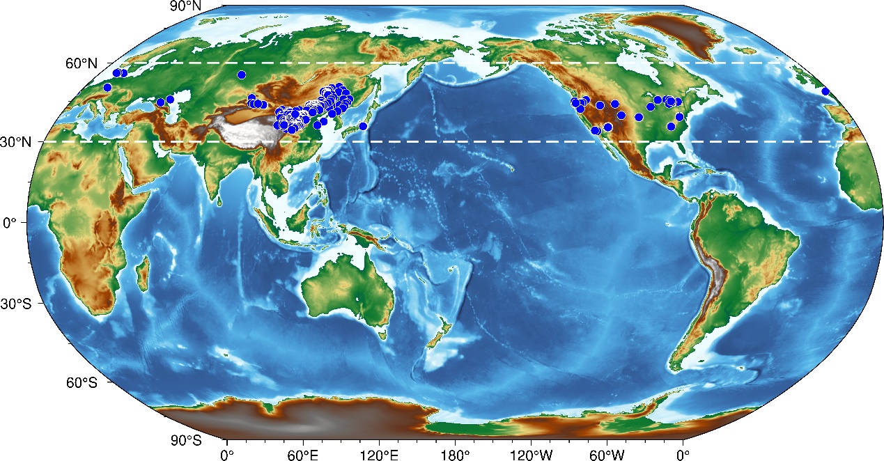 麻豆视频 麻豆视频 联合相关合作单位近期开展了一项研究,尝试利用土壤有机碳同位素指标进行古温度重建,并成功定量了季风边缘区全新世夏季温度和活动积温的变化过程。该研究选择东亚季风边缘区的浑善达克沙地东缘格类河(GLH)砂黄土剖面为研究对象,获得了该剖面全新世δ13Corg的变化结果;并从北半球中纬度地区(30N—60N)筛选出与该剖面相近热量带(限定T 10 C活动积温在1800~4200C·d范围内)的792个表土样点(图1),结合欧洲中期天气预报中心(ECMWF)提供的全球气候第五代大气再分析数据(ERA5),系统分析空间表土样品有机碳同位素与现代温度和降水之间的相关关系。