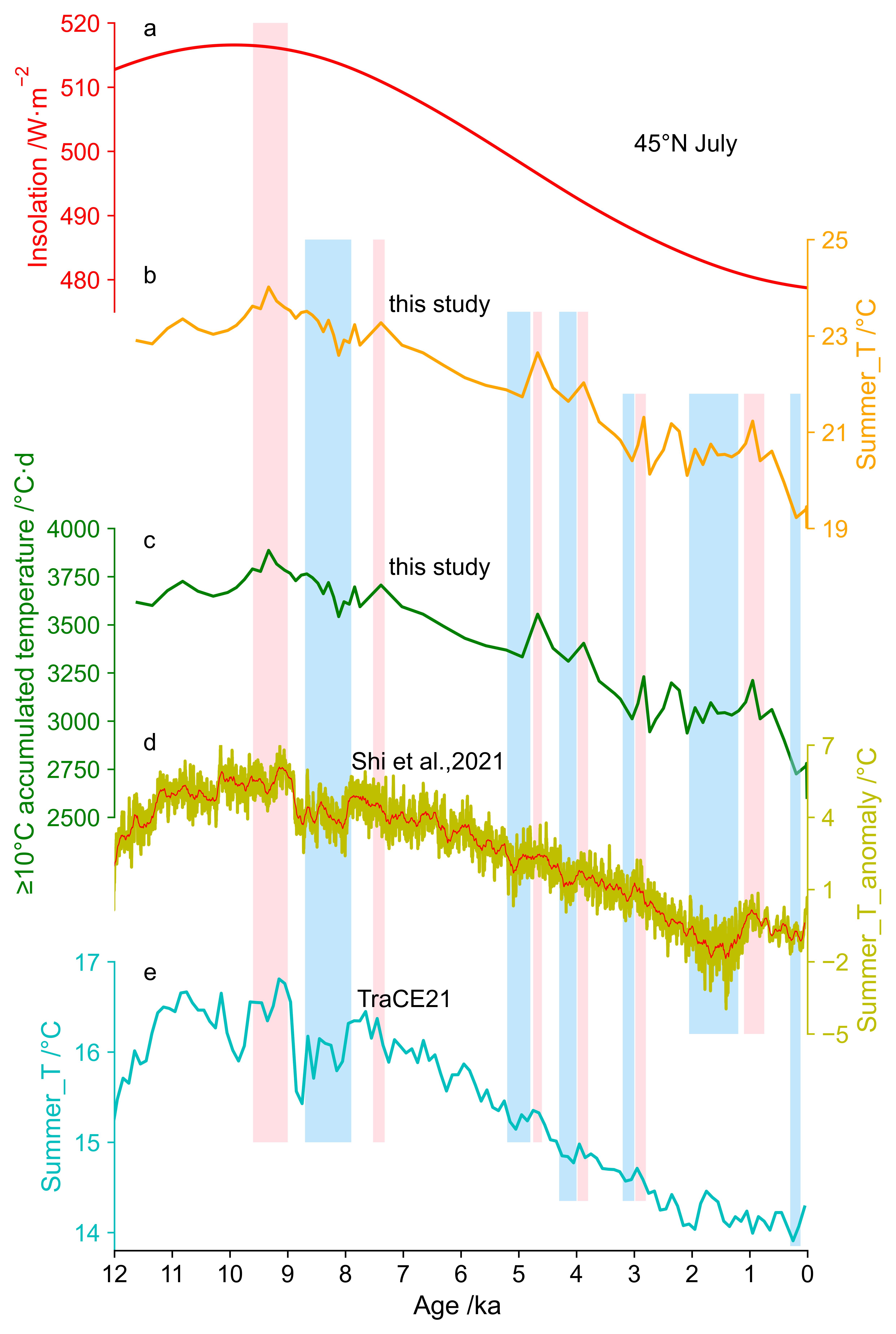 图4 本研究重建结果与其它相关研究结果的比较。 a 12 ka以来45°N的7月太阳辐射变化(Laskar等,2004);b本研究重建的夏季温度;c 本研究重建的10°C以上活动积温;d 通过整合仪器数据、代用记录和模式模拟重建的中国北方夏季温度(Shi等,2021);e基于TraCE21模拟的GLH剖面位置的夏季温度。图中的粉红色阴影带代表温度峰值,而蓝色阴影带代表温度谷值。