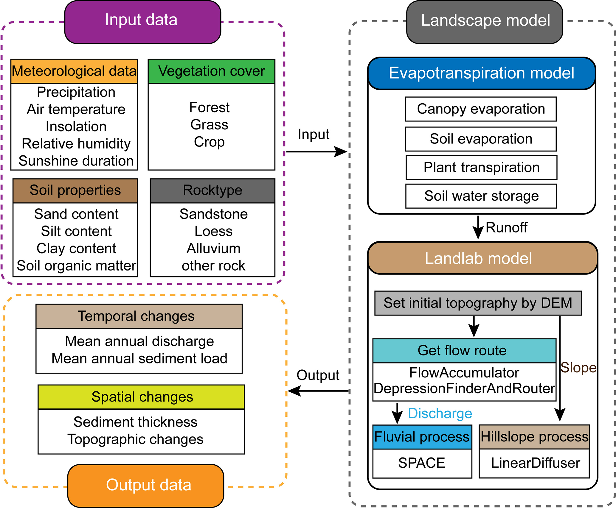 我们通过耦合植被生态模型(BIOME-BGC)与地貌演化模型(SPACE),基于公海湖与邙山等地区的古气候重建数据,结合全球土地利用变化面积重建结果(KK10),对黄土高原渭河流域在过去8000年间的河流地貌演化过程进行了数值模拟(图1)。通过对比有、无人类活动影响的两种模拟情景,计算了土地利用变化影响下河流系统响应气候变化敏感度的变化,定量化研究了人类活动强度增加背景下河流系统的非线性响应过程。