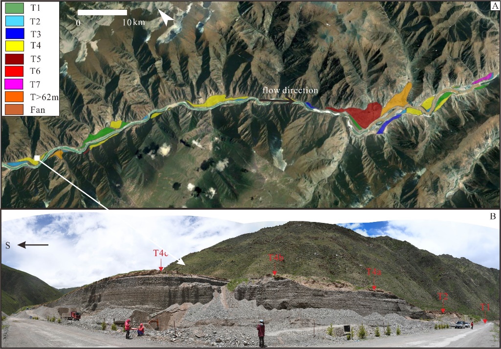最近,麻豆视频 教授王先彦和博士生于洋等在长江源通天河开展了河流地貌过程的研究,取得了重要进展,相关研究结果发表在国际知名学术刊物《GSA Bulletin》上。该课题组通过对通天河流域不同构造背景区河流阶地(图2)、沉积过程和光释光年代的详细对比研究,发现强烈的构造活动和极端的坡地过程等,导致峡谷区和盆地区河谷在末次盛冰期同时快速堆积和侧向拓展(侵蚀),形成超过60 m厚层堆积;在末次冰消期,季风逐渐增强时期,河流下切形成多级堆积阶地(图3)。